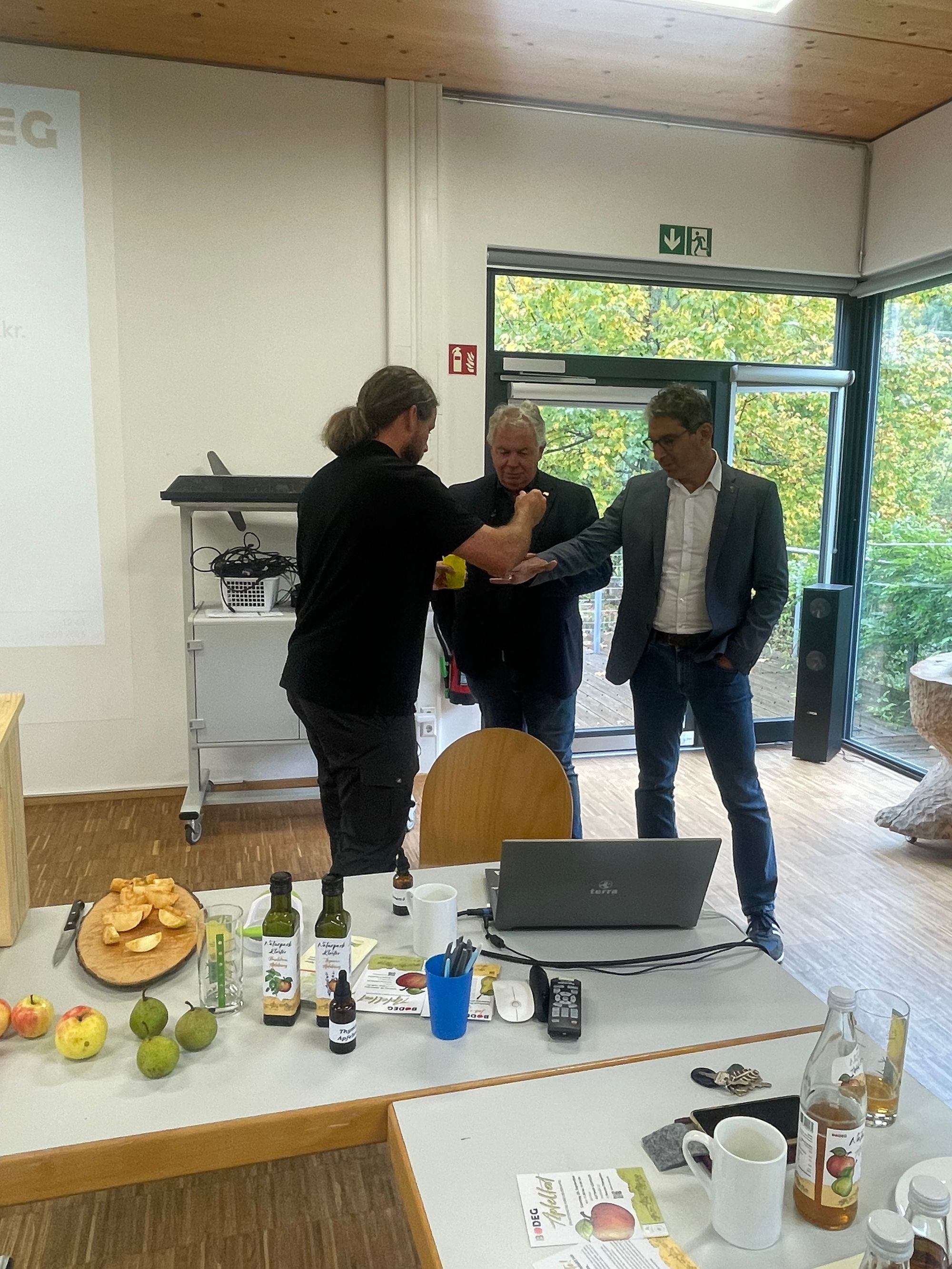 Zum Abschluss konnten die Gäste verschiedene Essigsorten und Säfte aus der Vermarktung der BODEG verkosten. Die hohe Qualität der Produkte begeisterte besonders MdL Höh. Von den Fachvorträgen über den konstruktiven Austausch bis hin zur Verkostung bot der Vormittag ein vielfältiges Bild vom Engagement der BODEG für die Region.